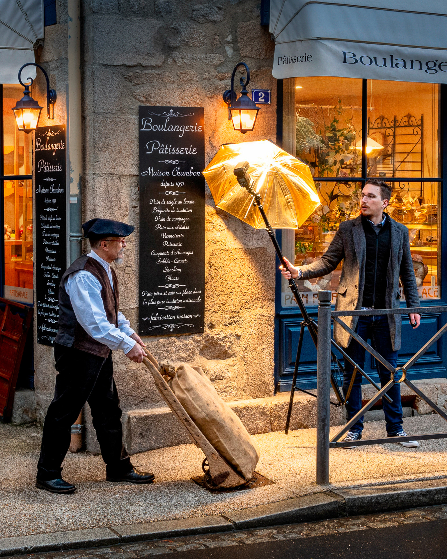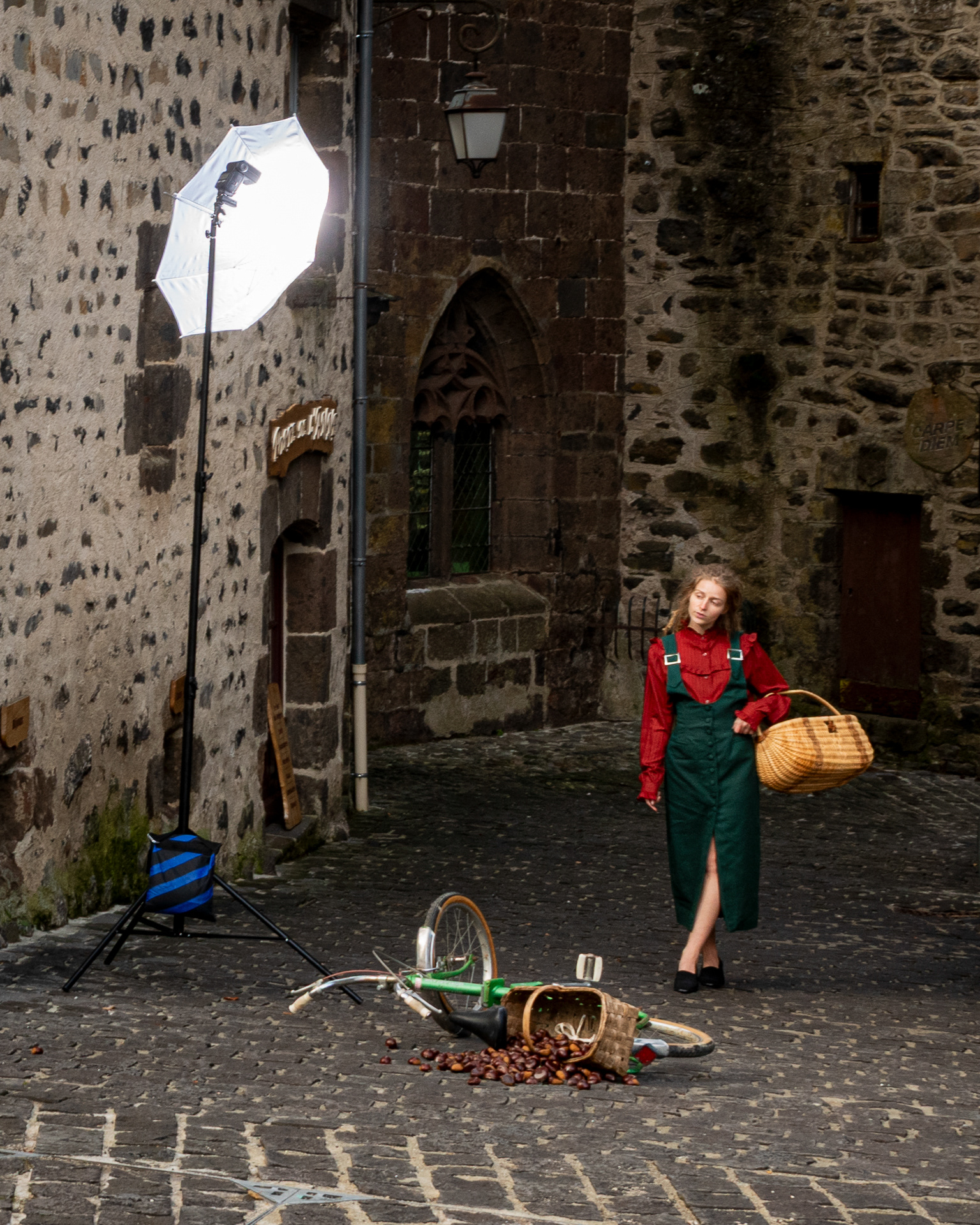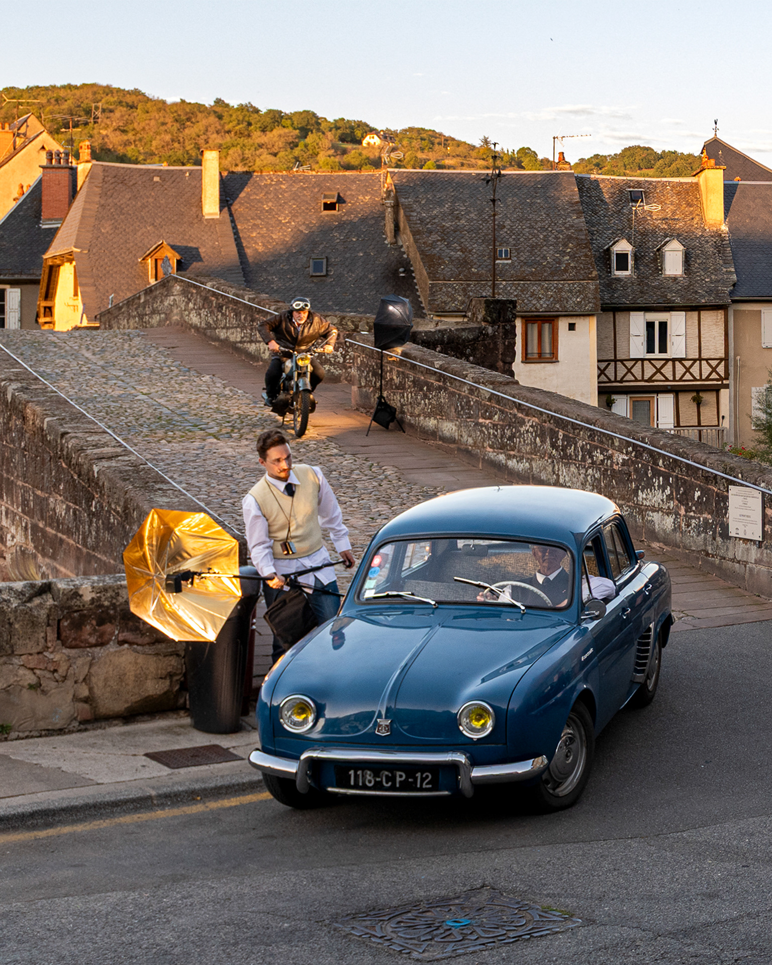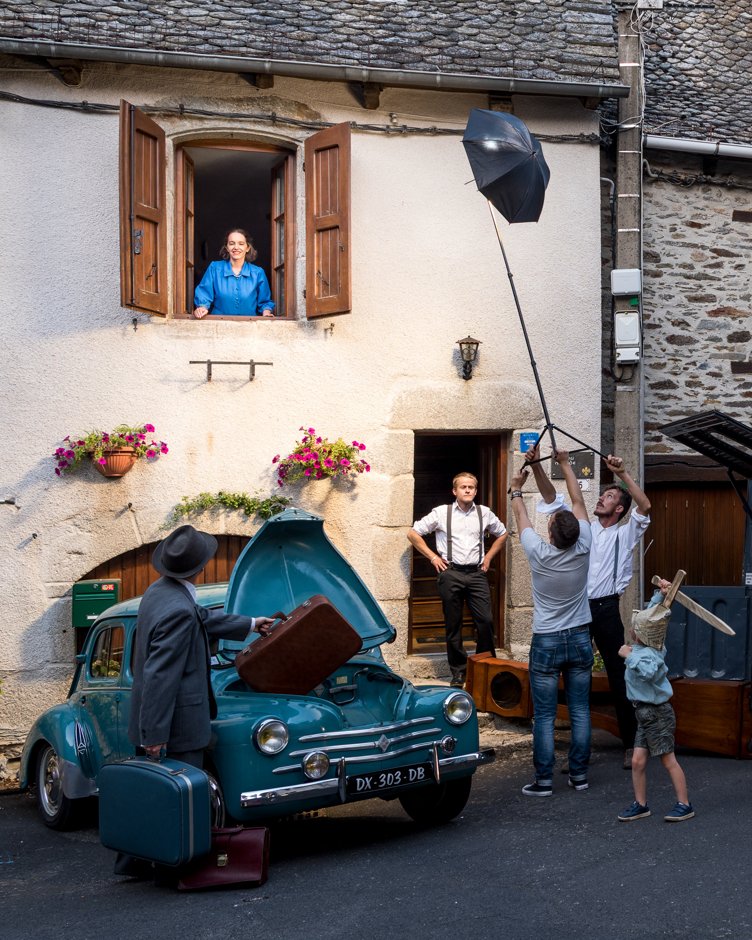 L'étape suivante est de s'assurer que le lieu choisi est accessible en demandant l'accord du propriétaire s'il s'agit d'une propriété privée ou même parfois demander la fermeture d'une rue à la mairie. Pour les véhicules, je vais à la rencontre des différents clubs de collectionneurs du Cantal et quand je recherche un véhicule en particulier c'est toujours un bonheur de discuter avec ces nombreux passionnés qui ont toujours été ravis de mettre en avant dans mes réalisations leur véhicule. La dernière étape est de trouver les figurants et leurs tenues. Très souvent je fais appel à des amis et des membres de ma famille mais parfois je passe également des annonces sur les réseaux sociaux. Les tenues me sont, la plupart du temps, prêtées par Emmaüs Aurillac et j'ai eu la chance d'avoir, pour les premières mises en scène, des robes de la costumière MystiMiss.